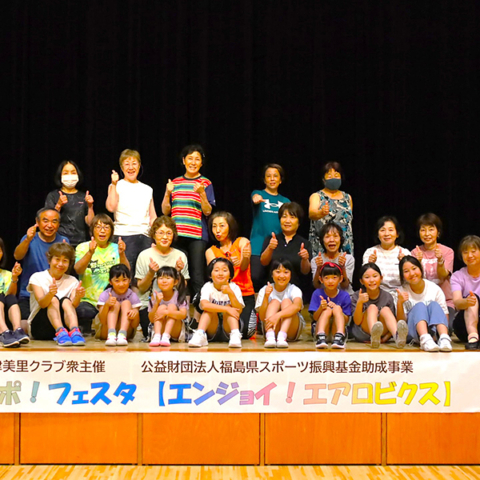 町内外の小学生から高齢者まで幅広い年代が参加したエアロビクス教室を開催し、参加者は水分補給や休憩を取りながら、約50分間のエアロビクスを楽しみました。