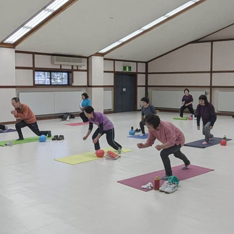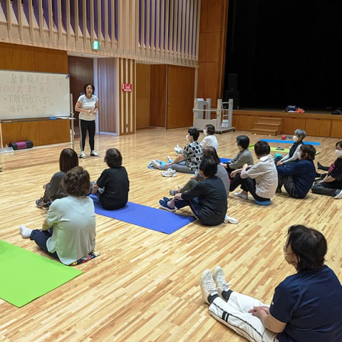 成人を対象とした運動教室として、腹筋や背筋に効果的なエクササイズ、さまざまなスクワット、ギムニクボールを使ったバランス運動などのメニューを行いました。