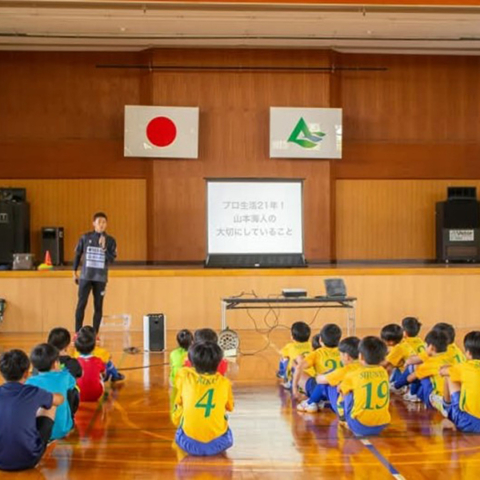 元サッカー日本代表選手の山本氏を講師に迎え、21年にわたるプロ生活をもとにした講話と、さまざまなボールを使ったキャッチボールやチームリレーなどの実技指導が行われました。