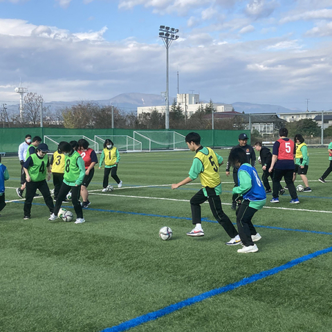 福島ユナイテッドFCの元選手やアカデミーの監督、コーチなどサッカーのプロによる指導のもと、ストレッチやボールを使ったウォーミングアップ、ドリブル、シュートの練習を行い、最後は試合形式のゲームを楽しみました。